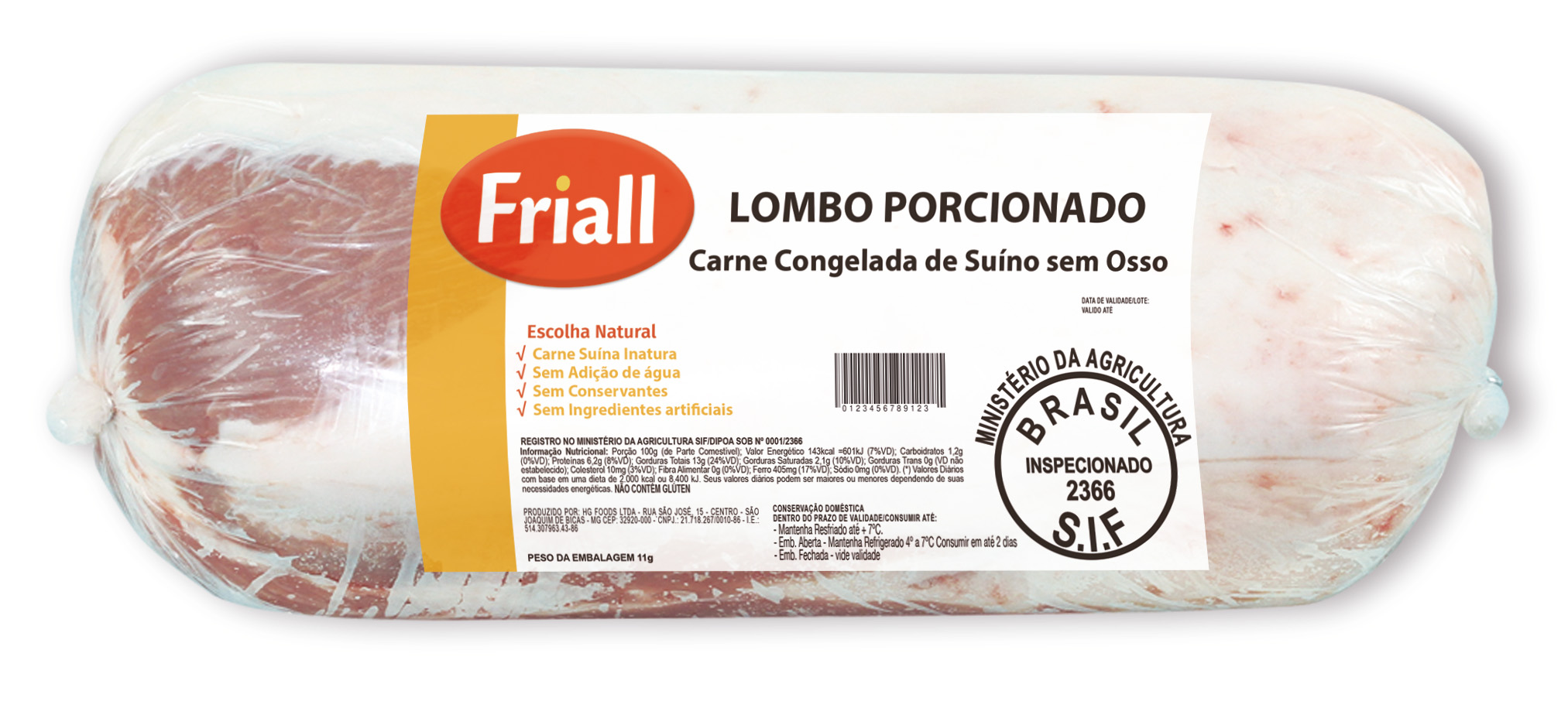 | Conservação | CONSERVAÇÃO DOMÉSTICA: Embalagem Fechada: Em freezer (-12°C ou mais frio): 365 dias Em congelador (-12°C a -8°C): 180 dias Emb.fechada no refrigerador ( 2°C a 7°C): 5 dias Emb. Aberta no refrigerador 2 dias. Em temperatura ambiente: Consumo imediato. Se descongelar, não congelar novamente. |